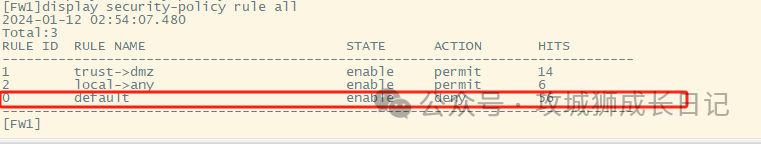 复制security-policy rule name local->any source-zone local action permit1.2.3.4.(3) 验证ASPF功能,默认情况下,防火墙是使能了ASPF的功能。我们先把它undo掉