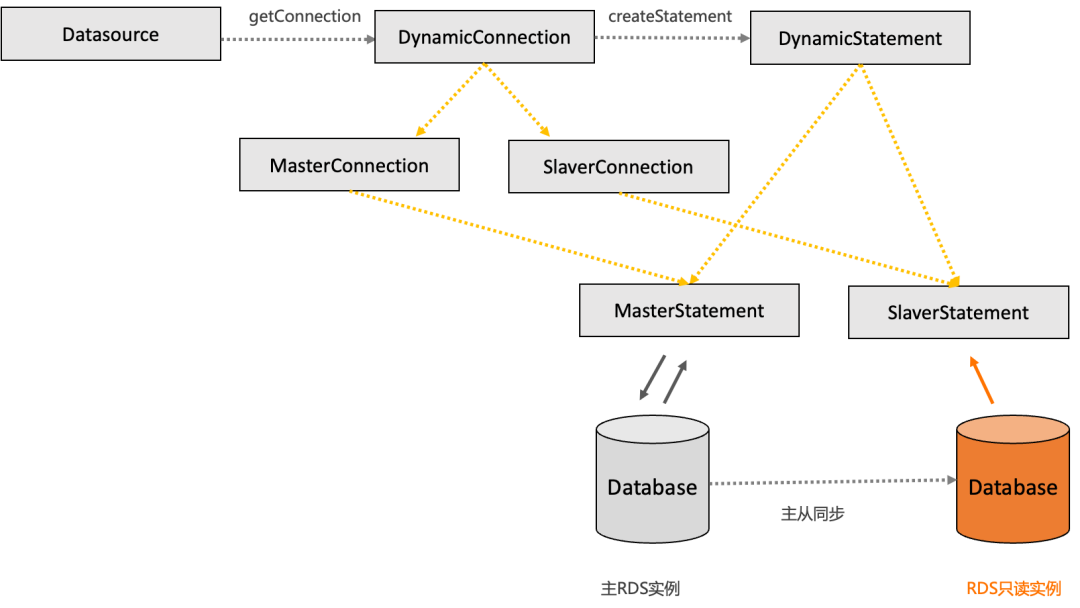 MSE 在数据源层面实现了抽象,其中 DynamicConnection、DynamicStatement 会根据具体规则从而实现 Master/Slaver 的切换,做到根据 SQL 的读写类型、事务的状态以及用户的业务规则来做 SQL 的路由,将符合条件的读 SQL 请求转发至 RDS 只读实例中。