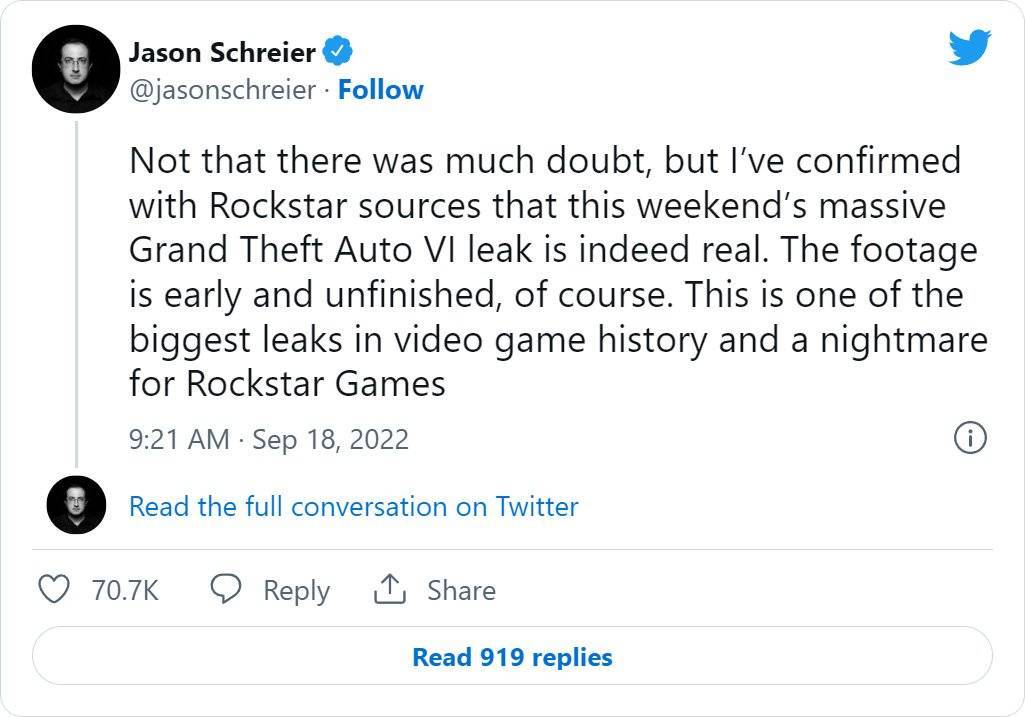 Rockstar确认被入侵彭博社Jason Schreier发推确认了Rockstar被黑及数据泄露的真实性。