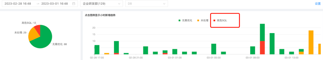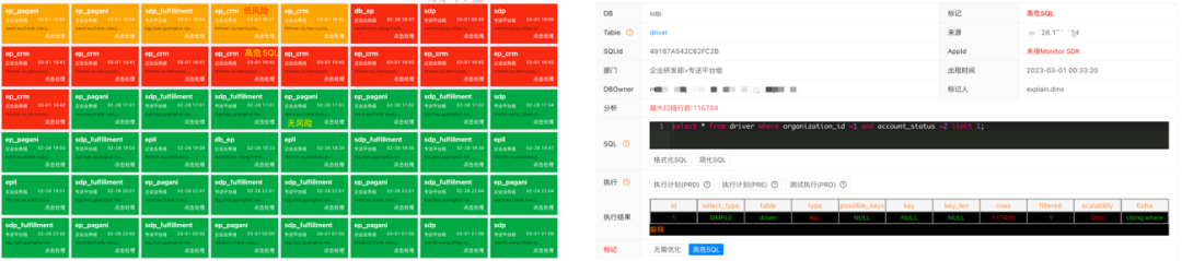 SQL事前发现通过对预发环境的 SQL 旁路然后将旁路结果对历史记录进行对比就可以很容易发现每天DB新增了那些慢、危险SQL,然后及时地预警给测试跟研发同学进行优化改造。同时与发布系统打通进行卡口、未优化完成的 APPID 禁止发布,起到拦截作用。