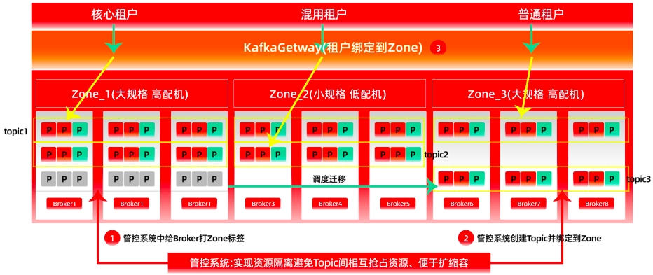 这样设计的好处是实现资源隔离的目的、故障隔离的目的。比如某个Zone的机器异常不会影响其整体,同时对于单个Topic读写过大导致的资源占用也能很好的应对,同时还解决了Topic自由调度的问题,比如可以将一个小规格Topic迁移到大的Zone内,过程是对业务无感的也不用换链接地址。最后对提高资源利用率有很好的作用,因为不同Zone用的机器规格可能是不同的,日常扩缩容可以精确到Zone,避免集群整体扩容造成的浪费及业务影响。