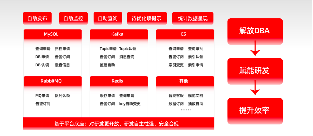 DBA日常维护了MySQL、Redis、Kafka、ES、MQ等中间件,支持上千人的研发团队,日常咨询量减去知识库拦截率实际需要DBA人工支持的Case每天不足20个,研发日常大部分需求都可以通过DMS自主解决。