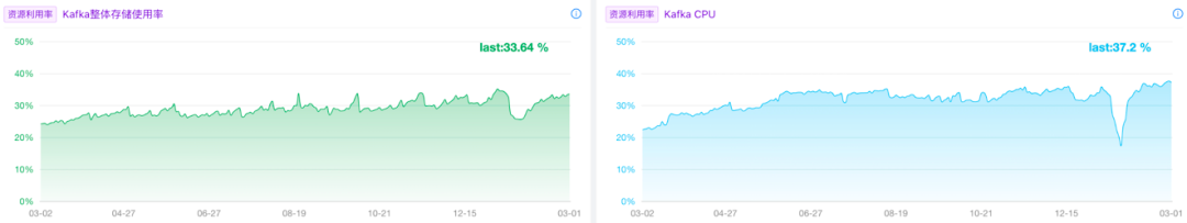 Kafka历史上为应对突发消息暴涨我们规定了存储使用超过50%可能就要扩容了,当前的磁盘、CPU平均使用率还是比较高的。