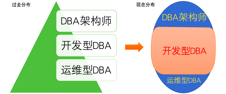 开发型 DBA:懂开发似乎是今天 DBA 的标配能力了,这类严格来说不是DBA了,我们今天一直说的泛化 DBA 其实就指的这类型的 DBA,而不是说你可以维护几款数据库产品,对他们的要求是很高的,一方面懂数据库,懂数据运维,懂开发(前端+后端),懂数据库周边生态工具,以及快速的学习能力,因为上云的大趋势下 DBA 不在为基础设施所拖累 DBA 承载的面就要扩展,最后可能还是自己的产品经理,因为没有人给你画原型图也没有人告诉你页面该长成什么样子,什么地方该放什么按钮以及他是什么颜色的…,这些都要建立在上述复杂的要求之上。DBA 架构师:这类 DBA 是经验+意识型的 DBA,对数据库有深度的理解、综合技术全面、对内知道什么阶段做什么事有清晰的规划,对外能搞定研发并建立良好的团队协作关系、能扛事也能搞事(推动做事)、建立个人及团队整体影响力。个人觉得上云后 DBA 的分布也应该是橄榄型的,大量的开发型 DBA 承担基建工作,很少量的运维型 DBA 仍旧承担传统 DBA 的部分工作,DBA 架构师来掌控全局。