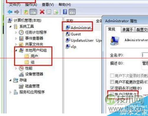 2、在打开的计算机管理界面中依次点击“本地用户组——用户”,然后在右侧列表中右击administrator选择属性,在弹出的属性窗口中,然后取消勾选“账号已禁用”,之后点击确定按钮即可。