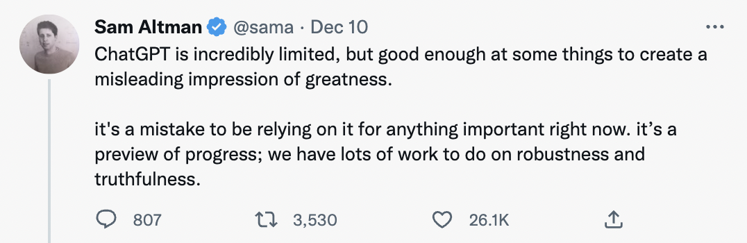 Altman最近发出的警告可能并不是对上周AI Beat专栏的回应。更有可能的是,是过去10天来的大规模炒作和铺天盖地批评的回应。到目前为止,OpenAI公司的ChatGPT被支持者描述为一种“轰动”和“最具颠覆性的技术”,但也有批评者指出,“ChatGPT有点像你在酒吧遇到的那个喝醉的免费信息发布网女孩,她一直在喋喋不休地说话,有一些是真话,有一些是废话,但你肯定不会想把她带回家去见你的父母。”