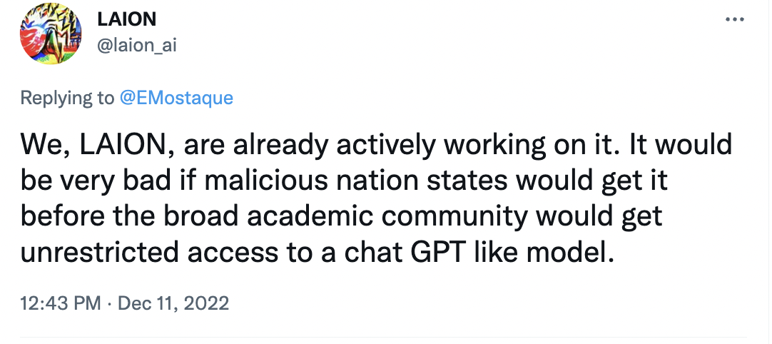 当然,虽然StabilityAI公司首席执行官Emad Mostaque说得很清楚,但正是这么说,代表了硬币的另一面:昼夜不停地工作以开发ChatGPT的开源变体的开发人员。