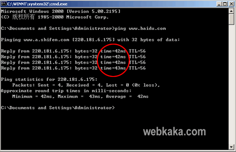 注意红色圈出的时间,如果大于100ms,那证明你的网速是十分的慢,一般在30-50ms之间。其实,这个ping方法不能算出你的网速是多少KB,它只能大致说明你当时的网速快慢而已。所以,这个网速测试方法是不太可取的。
