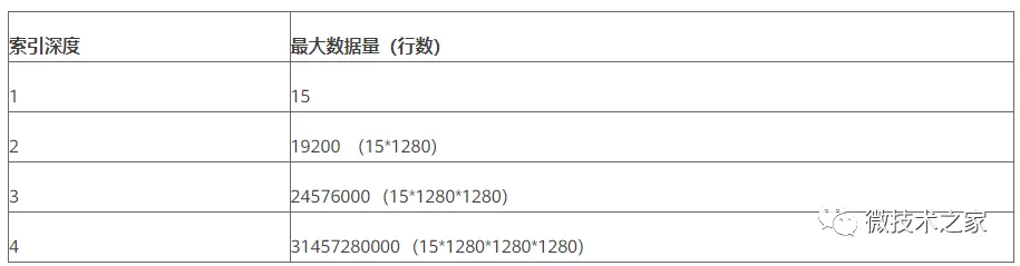 MySQL 默认是 16K 的页面,抛开它的WordPress模板配置 header,大概就是 15K,因此,非叶子节点的索引页面可放 15*1024/12=1280 条数据,按照每行 1K 计算,每个叶子节点可以存 15 条数据。同理,三层就是 15*1280*1280=24576000 条数据。只有数据量达到 24576000 条时,深度才会增加为 4,所以,索引深度没有那么容易增加,详细数据可参考下表: