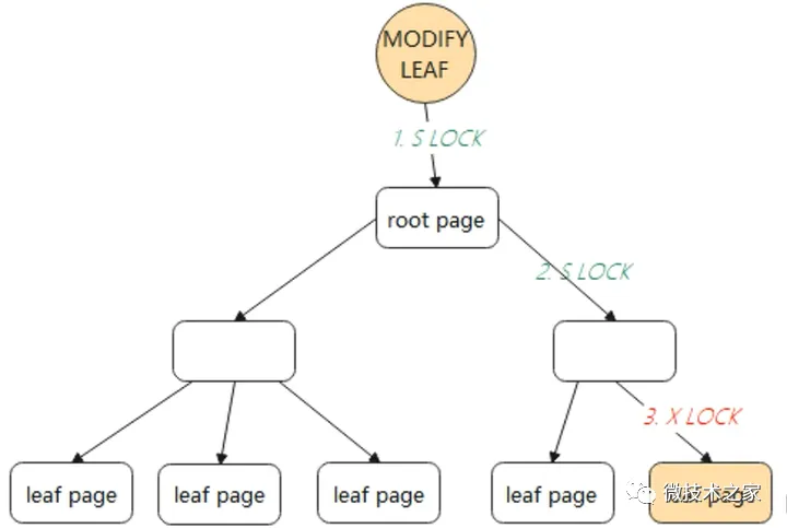 方式一,先采用乐观锁的方式尝试进行修改对根节点加 S 锁(shared lock,叫共享锁,也称读锁),依次对非叶子节点加 S 锁。