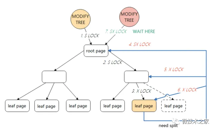 在整个 SMO 过程中,根节点始终持有 SX 锁(SX 锁表示有意向修改这个保护的范围,SX 锁与 SX 锁、X 锁冲突,与 S 锁不冲突),此时其他的 SMO 则需要等待。