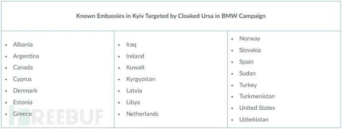 Unit 42 团队指出此次网络攻击活动主要针对基辅 80 多个外国使团中至少有22个使团,其中主要包括美国、加拿大、土耳其、西班牙、荷兰、希腊、爱沙尼亚和丹麦的使团。目前,站群服务器受害目标的感染率尚不清楚。